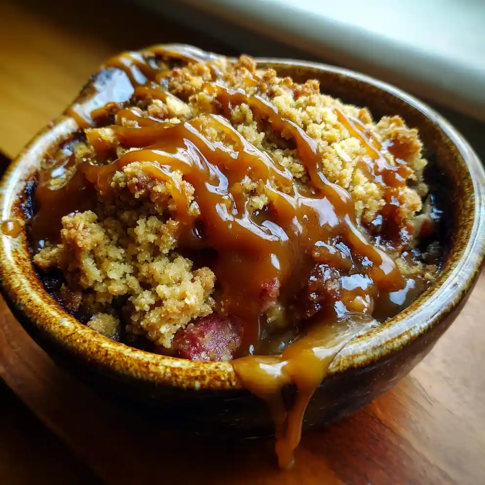 Let the crisp cool for at least 15-20 minutes before serving; this allows the filling to set slightly, preventing it from being watery. Serve warm in individual rustic ceramic bowls with a generous ribbon of the brown butter caramel drizzle.