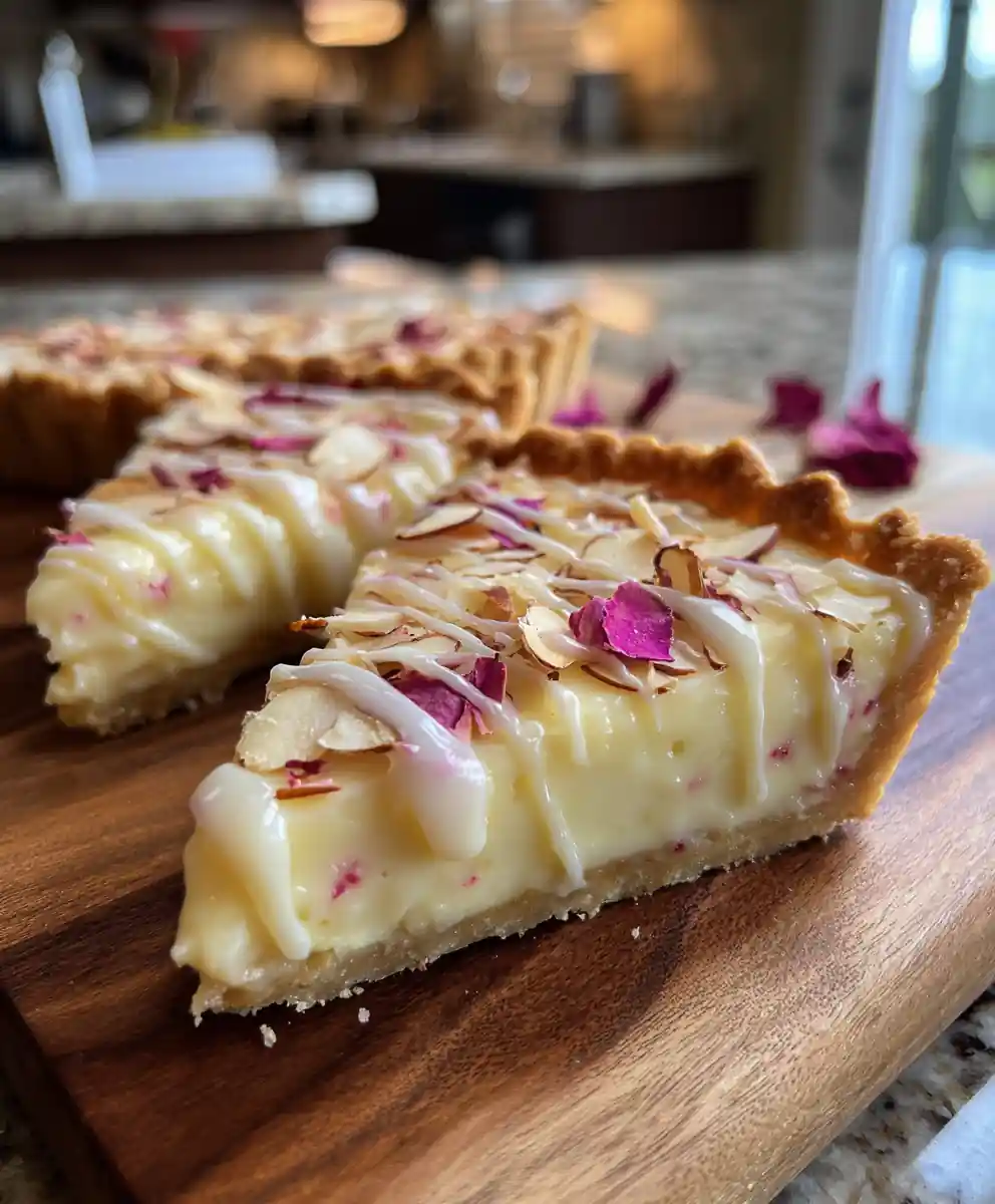 - Drizzle & Garnish: Melt white chocolate with rose water; drizzle over tart; garnish with almonds and rose petals.