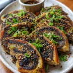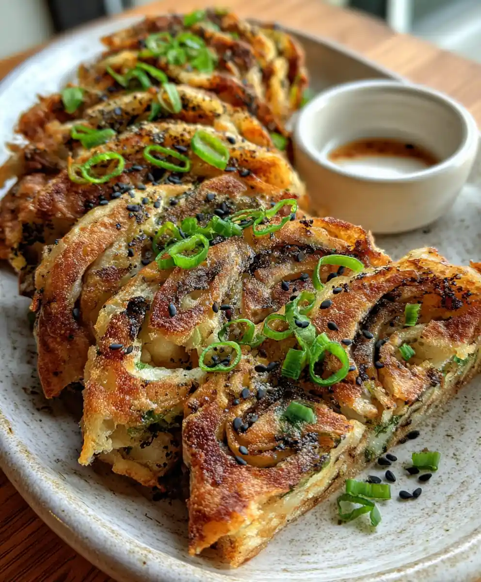 A flavorful upgrade to classic scallion pancakes, this recipe features a savory black sesame and roasted garlic swirl. The hot water dough technique results in crispy, chewy, layered pancakes perfect for family dinners or entertaining.