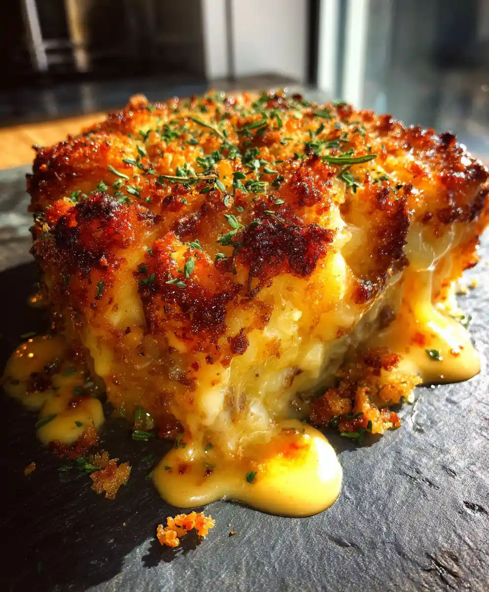 11. Rest and Serve: Let the casserole rest for 10 minutes before cutting. This allows the layers to set and makes it easier to serve. Plate on a warm, neutral-colored plate. Drizzle any leftover chipotle cheese sauce from the pan around the slice for extra flavor and visual appeal. Garnish with a small scatter of the toasted rosemary breadcrumb crumble for added texture and contrast.