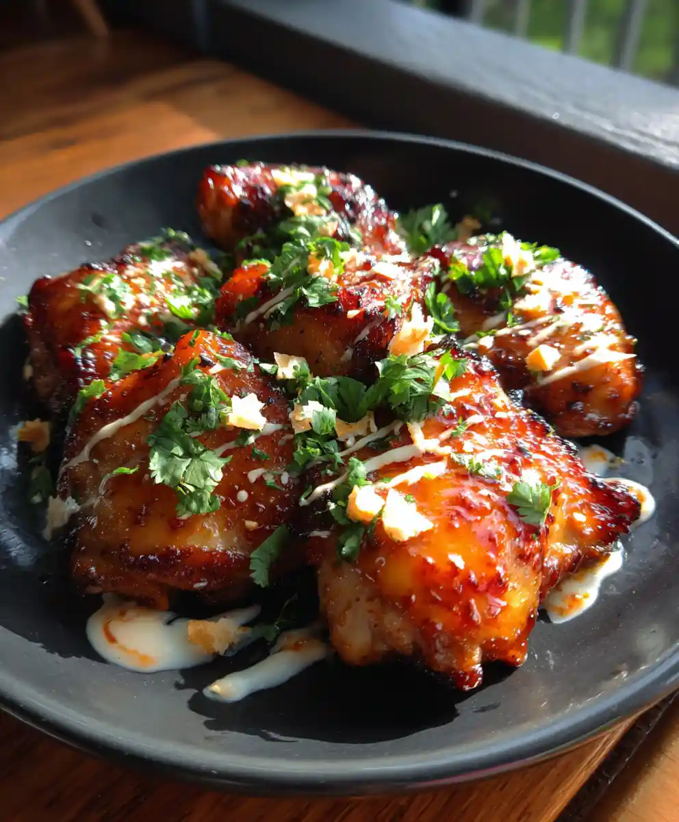 These Sticky Sweet Chili Chicken Thighs combine sweet, spicy, and tangy flavors with a creamy coconut-lime drizzle. This easy recipe delivers crispy skin and tender meat for a satisfying meal.