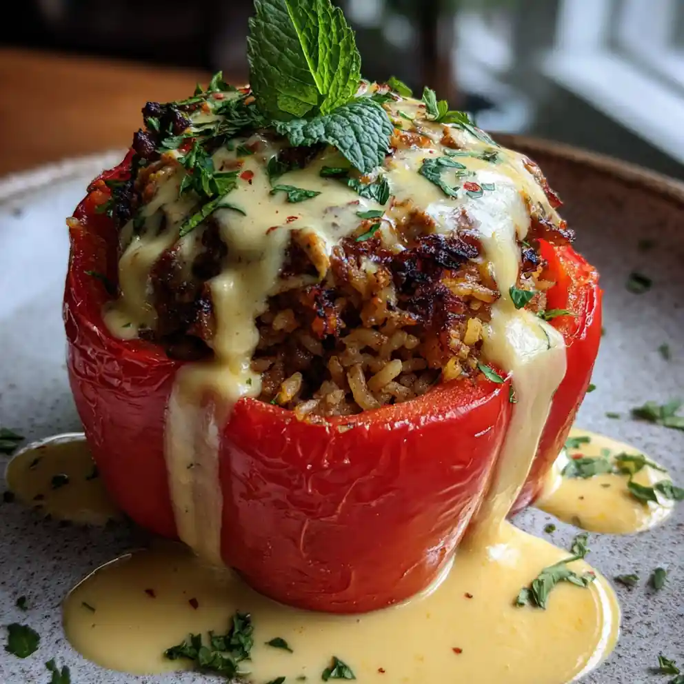 This recipe for stuffed bell peppers features a hearty ground beef and rice filling seasoned with Mediterranean spices. The peppers are baked in a tomato sauce base and finished with a creamy lemon-tahini sauce, offering a savory-sweet, family-friendly meal.