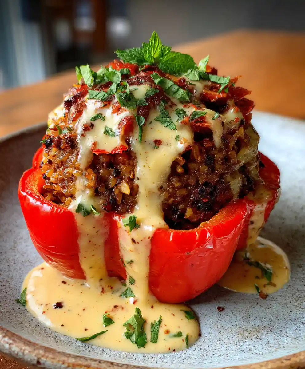- Rest and Serve: Let the stuffed peppers rest for 5-10 minutes before serving. Drizzle generously with the remaining fresh creamy lemon-tahini sauce and garnish with fresh herbs.