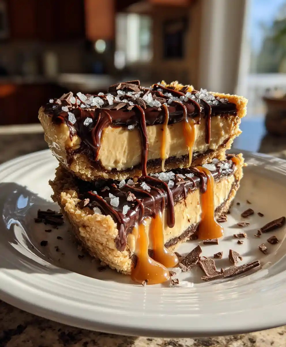 Indulge in a luscious peanut butter pie featuring a toasted oat almond crust and a delightful salted caramel ribbon. This pie offers a symphony of textures and flavors, perfect for any sweet craving.