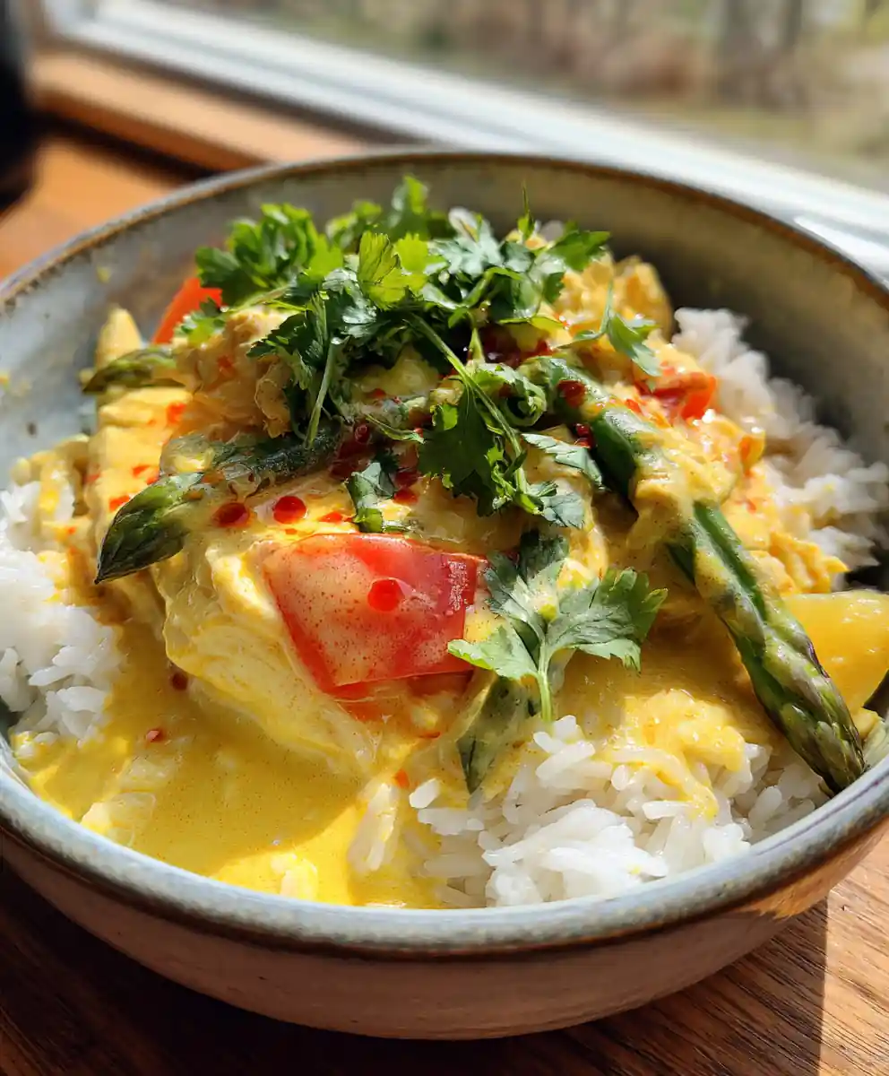 8. Serve: Ladle curry over cooked jasmine rice and garnish with a drizzle of the fragrant oil and fresh cilantro.