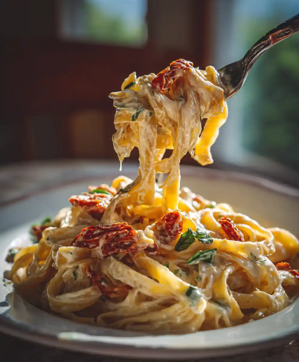 A light yet rich vegan alfredo sauce made with cashews, enhanced by roasted garlic and a vibrant sun-dried tomato ribbon for sophisticated flavor without heavy dairy. This recipe offers a velvety texture and rich flavor from simple pantry staples.