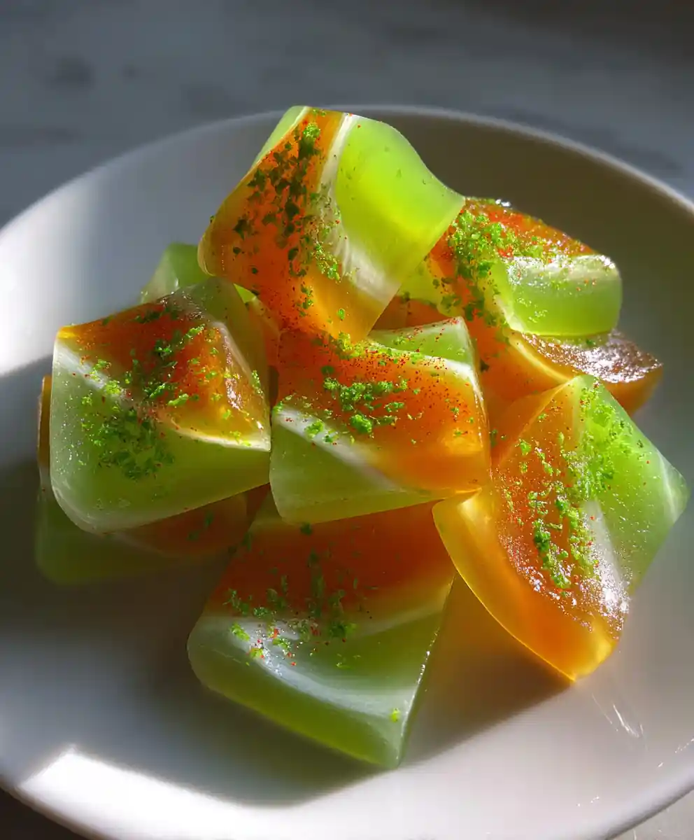 6. Garnish and Serve: Arrange gummies on a plate and lightly dust with grated lime zest and a small pinch of chili powder before serving.
