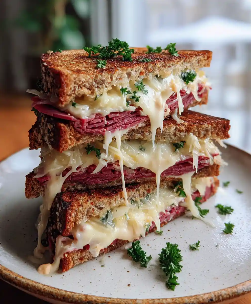 Serve warm, optionally garnishing with extra dressing and finely chopped fresh parsley for a vibrant color contrast. This vegan reuben sandwich recipe is a perfect easy dinner idea.